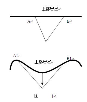 冰輒理論認為:地殼運動與巖漿無關,它是地殼自身結構關系的進一步調整,是地殼自身重力作用的結果。至于山脈的形成,我認為同樣與地下斷裂密切相關,地下斷裂是地質活動的結果,地下斷裂的的擴大與發(fā)展更是地質活動的基本運動形式。隨著地下斷裂的擴大與發(fā)展,底層斷裂區(qū)域承壓能力逐漸降低,上部巖層也因地下斷裂的擴大,最終發(fā)生自身重力作用下的區(qū)域性沉降。如圖1所示AB、A1B1為斷裂上部的巖層,初始階段斷裂較小上部巖層AB無彎曲,隨著時間的推移斷裂逐漸增大斷裂上部巖層在重力作用下逐漸發(fā)生彎曲(如A1B1所示),這時,區(qū)域性沉降的上部巖層的兩端A1、B1處相對隆起,產生褶皺,這就形成了山脈。