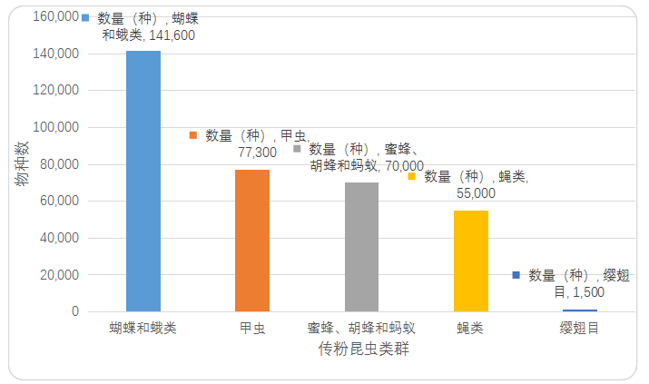 傳粉昆蟲占所有動物傳粉的80%~85%,為植物-傳粉者生態(tài)系統提供重要服務,其重要性得到科研工作者和大眾的廣泛認同。據估計,全球生物物種多樣性約870萬,昆蟲占一半以上,是自然界最主要的傳粉者。目前,已報道的傳粉昆蟲約35萬種,涉及鱗翅目(約14萬種)、鞘翅目(約7.7萬種)、膜翅目(約7萬種)、雙翅目(約5.5萬種)以及其他類群(約0.8萬種)。蜜蜂是最主要的傳粉昆蟲,約有17,000種,全球107種重要作物種類中的90%是由蜜蜂完成傳粉。