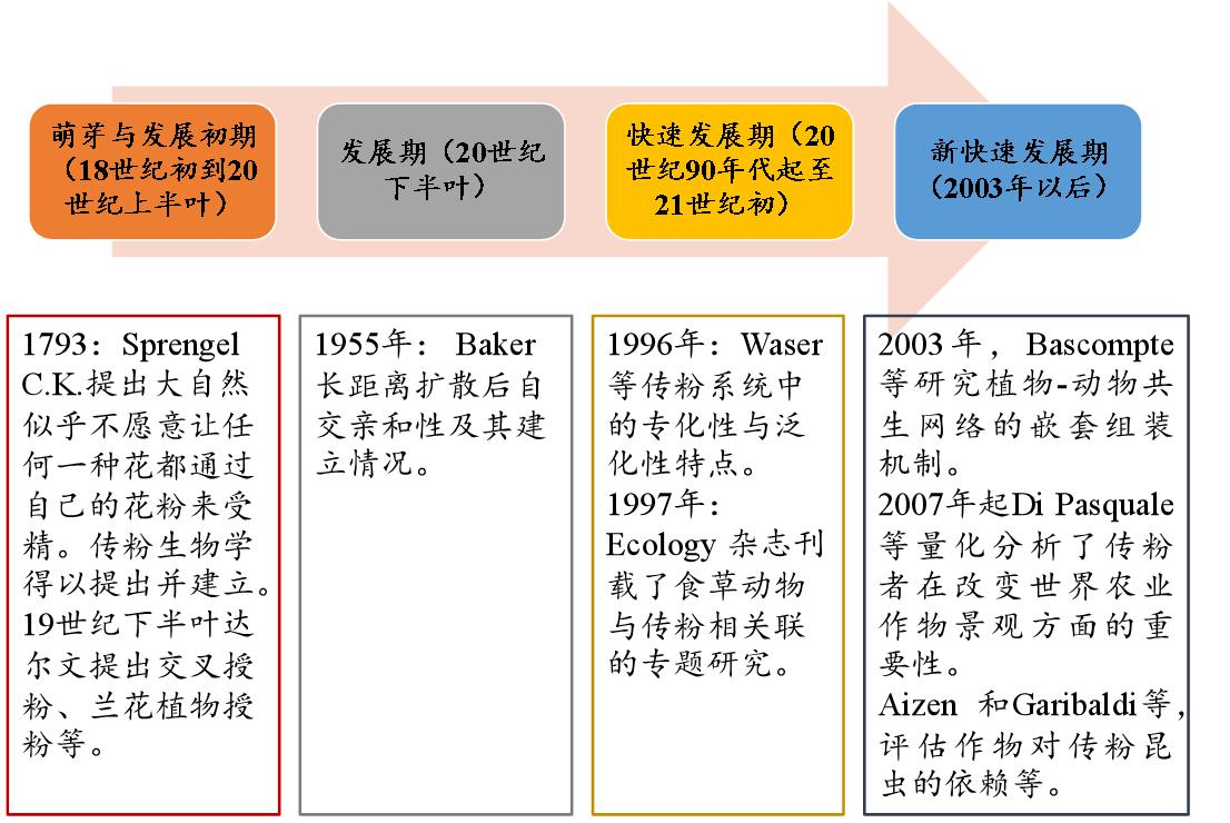 由于傳粉昆蟲的重要性以及目前所面臨的危機已經引起科學家和民眾的廣泛關注。諸多地區(qū)級、國家級乃至全球級別的傳粉研究已經取得了階段性的成果。就全球范圍來說,傳粉昆蟲的研究主要包括四個時期,分別為:1)萌芽與發(fā)展初期(18世紀初到20世紀上半葉);2)發(fā)展期(20世紀下半葉);3)快速發(fā)展期(20世紀90年代起至21世紀初);4)新快速發(fā)展期(2003年以后)。