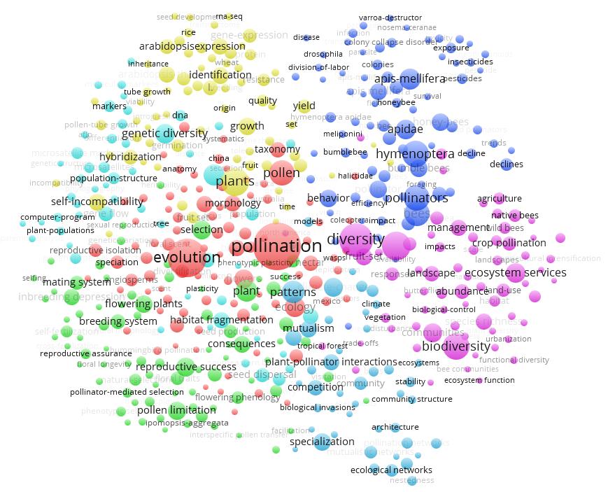 與此同時我們還通過ESI對pollination和pollinator等關鍵詞進行檢索,可以大致得出傳粉昆蟲研究領域的現有研究前沿如下:1)常用新煙堿類殺蟲劑對蜜蜂的殺傷作用;2)野生授粉昆蟲對農業(yè)增收和作物健康的積極影響;3)傳粉昆蟲種群測量與評估;4)花朵與傳粉昆蟲的生態(tài)聯系。通過利用Vos Viewer軟件繪制傳粉生物學關鍵詞共現(co-occurrence)聚類圖,獲得傳粉生物學領域的研究熱點包括:1)傳粉昆蟲的形態(tài)學、系統進化、分類學方面的研究;2)傳粉昆蟲介導的植物繁殖、選育、選種等的研究,以及花粉限制對傳粉昆蟲的影響;3)殺蟲劑導致傳粉昆蟲,尤其是蜜蜂、熊蜂的種群下降的影響;4)傳粉昆蟲介導的植物基因表達、生長、增產等;5)景觀變化、城市化等環(huán)境因素導致生物多樣性降低、傳粉服務功能下降、傳粉昆蟲群體數量下降等影響評估,并提出相關的控制與管理措施;6)植物-傳粉昆蟲互作與共生、植物與傳粉昆蟲形成的生態(tài)網絡結構等方面的研究;7)傳粉使植物基因流擴散,使植物基因變異和多樣性。