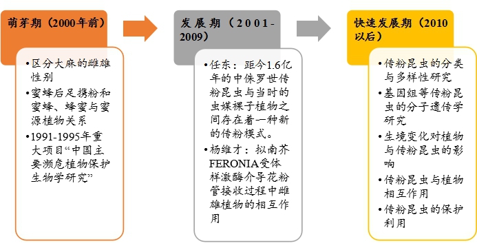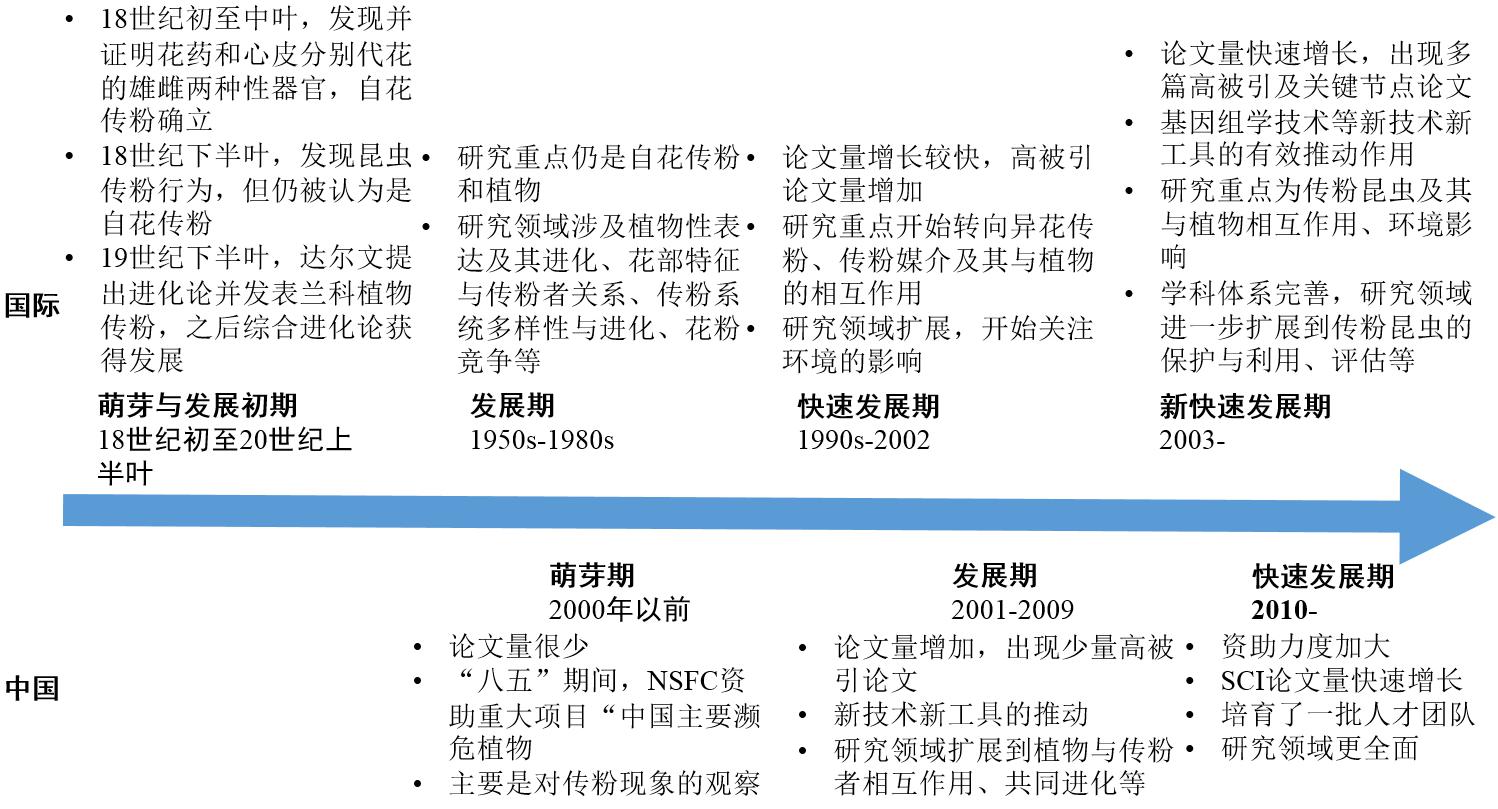 我國傳粉昆蟲研究員起步較晚,主要包括:1)萌芽期(2000年前);2)發(fā)展期(2001-2009年);3)快速發(fā)展期(2010年以后)。我國傳粉生物學領域的發(fā)展歷程如圖5所示,國內外的發(fā)展歷程比較如圖6所示。