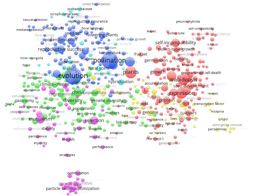 利用Vos Viewer軟件分析2013-2017年中國傳粉生物學領域的SCI論文,獲得中國傳粉生物學領域的研究熱點是:1)植物花粉管生長、發(fā)育等分子、細胞層面基礎機制研究;2)傳粉昆蟲的分類學研究,及其遺傳多樣性、保護、種群擴散等方面的研究;3)昆蟲傳粉在植物遺傳育種、進化中發(fā)揮重要作用;4)與傳粉相關的植物轉錄因子、microRNA、殺蟲劑耐藥性等方面的研究;5)傳粉昆蟲的種群優(yōu)化、傳粉昆蟲互作等方面的研究。