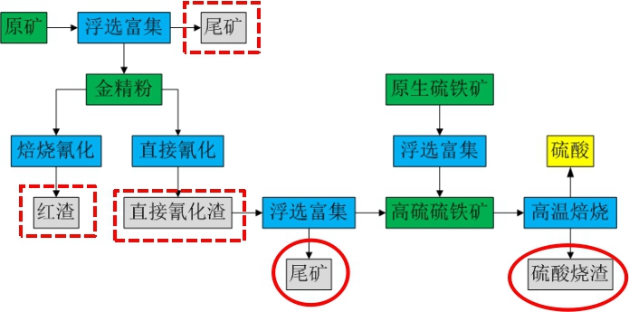 黃金生產(chǎn)過程的固廢包括浮選尾礦、氰化渣(紅渣和直接氰化渣)(圖3)。可對(duì)金精礦的浮選尾礦進(jìn)行氰化提金或制造建材,對(duì)直接氰化渣進(jìn)行浮選回收有價(jià)元素。