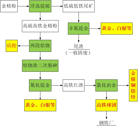 我們提出了黃金未來發(fā)展的一個(gè)思路。黃金綠色選冶技術(shù)包括以下三個(gè)部分:難選冶金精粉硫鐵富集選、兩段焙燒?氰化提金(含焙燒渣二次脫砷)、高鐵紅渣高值化綜合利用、尾礦非氰提金。終端產(chǎn)品包括金、銀等貴金屬、硫酸、銅、高品質(zhì)煉鋼粒鐵(球團(tuán))等。該流程產(chǎn)業(yè)鏈結(jié)構(gòu)完整,實(shí)現(xiàn)真正意義上的資源循環(huán)利用;綜合回收礦物中的金、銀、銅、鉛、鋅等有色金屬和鐵,各有價(jià)元素的資源化利用得到最大化,避免了資源浪費(fèi);實(shí)現(xiàn)了氰化尾渣的無害化利用,整個(gè)過程沒有危險(xiǎn)固廢產(chǎn)生,廢氣達(dá)標(biāo)排放,水循環(huán)使用無外排;能夠處理多元素含砷復(fù)雜金精礦,對(duì)原料的適用性強(qiáng)(圖4)。