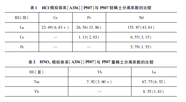 P507(III)萃取稀土按照正序萃取,遵循“四分組效應(yīng)”,稀土的分配系數(shù)隨著原子序數(shù)的增加而增大,而堿性萃取劑[A336]C1在HN03體系中通過陰離子交換萃取稀土是倒序萃取,稀土的分配系數(shù)隨著原子序數(shù)的增加而減小。兩種效應(yīng)共同作用,導致[A336 ] [ P507 ]分離稀土選擇性增強,相鄰元素間的分離系數(shù)明顯提高。同時,陽離子[A336]+和陰離子[P507 ]-的離子半徑大,空間位阻增加,也有助于提高稀土(III)的萃取選擇性。模擬實際體系的組分混合物,在HCl體系中在輕稀土間的分離系數(shù)也有較大的提高,尤其是Pr/Nd分離系數(shù)5. 79明顯高于P507體系的1. 55(徐光憲主編,《稀土》,第二版,1995 ) ,見表1。在HN03體系中重稀土Tm/Yb/Lu的分離系數(shù)較大,明顯高于目前的P507體系(李德謙等,中國發(fā)明專利,ZL200510016682. 6 ),見表2。[A336 ] [P507 ]的特殊結(jié)構(gòu)對部分稀土離子分離的選擇性方面比較突出,與其較大的空間位阻有關(guān)。