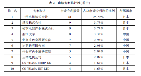 從不同年份上來看,中國專利不斷增加,原來口本比中國多,后來中國慢慢增多。但實用的還是不多,仍然還是一個問題,還得有進一步的提高。另外,從申請單位來看,排在前十名的都是中國和口本的一些單位(表2)。比如說三洋電機株式會社、湯淺株式會社、松下電器產(chǎn)業(yè)株式會社、浙江大學、北京有色金屬研究院、比亞迪等。