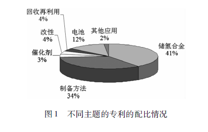 這里面是不同的研究主題分布,還是以儲氫合金的開發(fā)居多一點,然后還有催化劑、改性等(圖1)。我覺得在這里面可能有三個領(lǐng)域在技術(shù)上發(fā)展比較突出一點。第一個就是成分的改變,通過改變儲氫合金成分開發(fā)新的合金提高了鎳氫電池容量,是一個很重要的進步。傳統(tǒng)是ABS型的,后來跟ABS型的和AB2型的結(jié)合到一起,就變成了A2B7型的,這就是口本三洋公司開發(fā)出來的。這個儲氫合金成為了目前研究的主流,容量比傳統(tǒng)的要大很多,成分上的突破是一個很大的進步。第二個是甩帶快淬技術(shù)在儲氫合金粉體制備上的應(yīng)用,原來這種技術(shù)最早是用來制備非晶態(tài)合金的,后來用到了永磁粉體的制備,現(xiàn)在又開始進人到了鎳氫電池上面來了,對于鎳氫電池容量和穩(wěn)定性的提高都有非常大的幫助。第三個重要的突破的是儲氫合金表面改性,表面有一層鎳,可以進一步提高電導率,增加電流。這三方面是在技術(shù)上有了比較大的提高和發(fā)展。